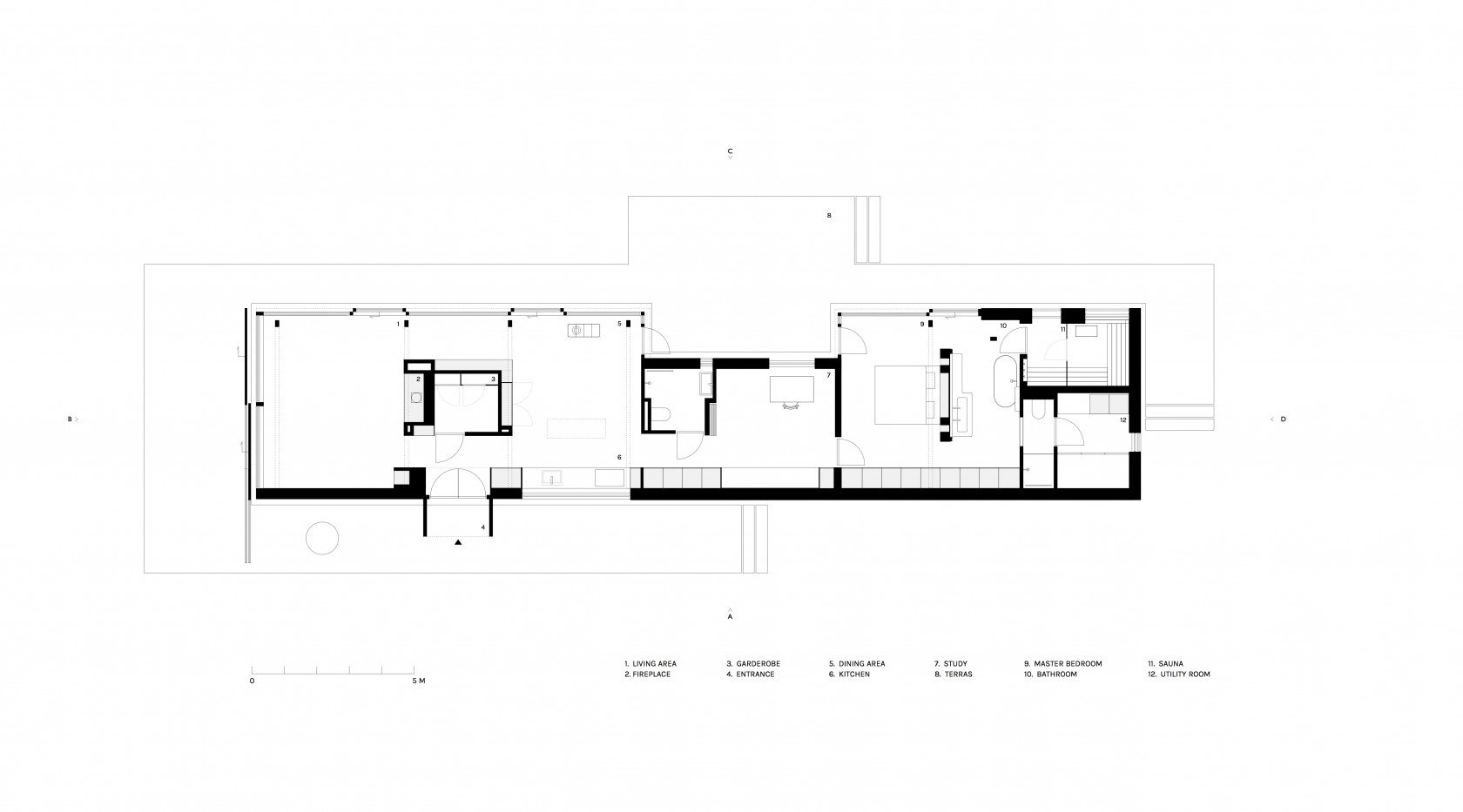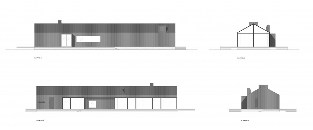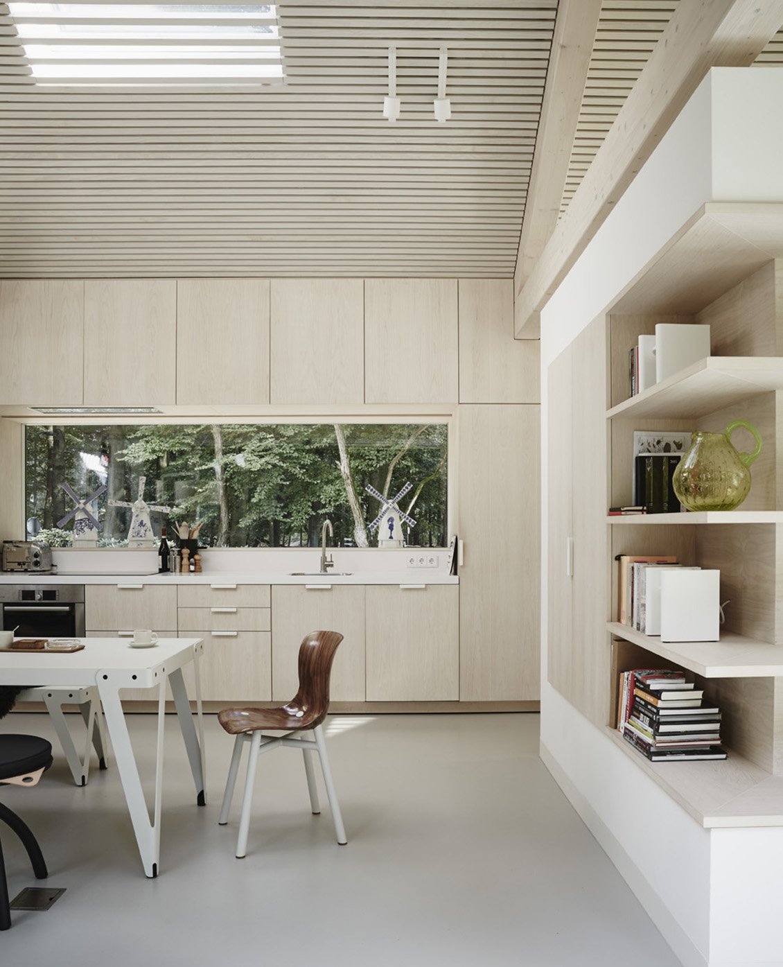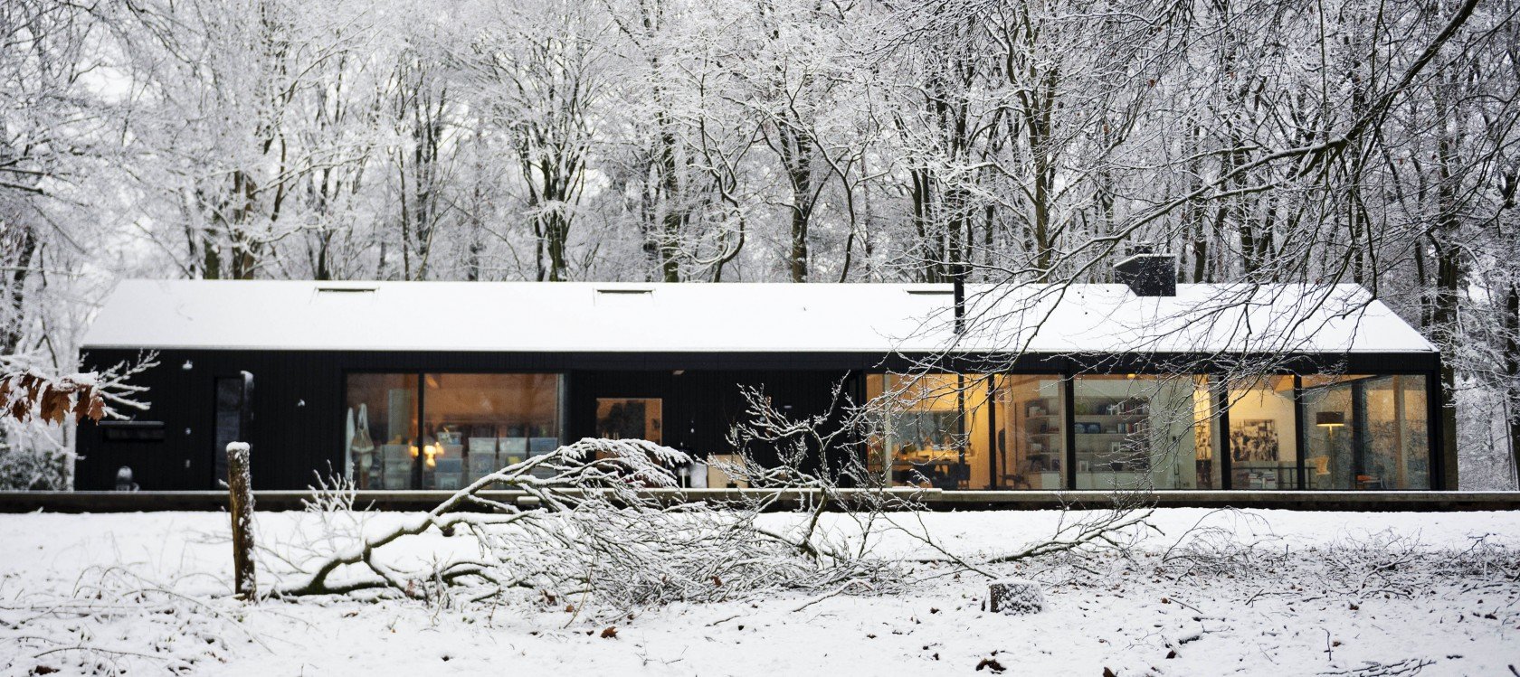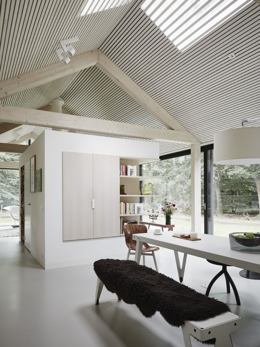 Privacy is guaranteed, as towards the street the house is constructed of opaque materials. This lengthy side of the house that runs alongside the living area towards the bedrooms comprises the functional zones, including the entrance, kitchen, ventilation and storage facilities. On the side of the forest, the house has been built up with glass and other transparent materials, guaranteeing a living zone that is full of light, evening out the transition between nature and the inhabited space. Like a darkened skin, the outer shell of the residency unifies the roof and the chimneys. On the inside the colouring scheme leans towards lighters shades: with mostly blond-coloured wood. All materials used for the exterior of the residency refer to the barn that was located on the parcel before the house was built.