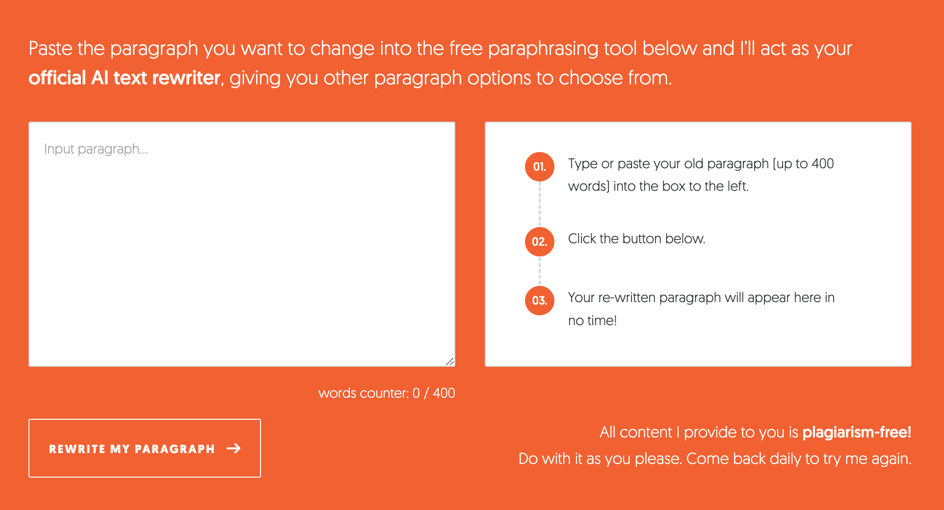 Paste the paragraph you want to change into the free paraphrasing tool below and I’ll act as your official AI text rewriter, giving you other paragraph options to choose from.