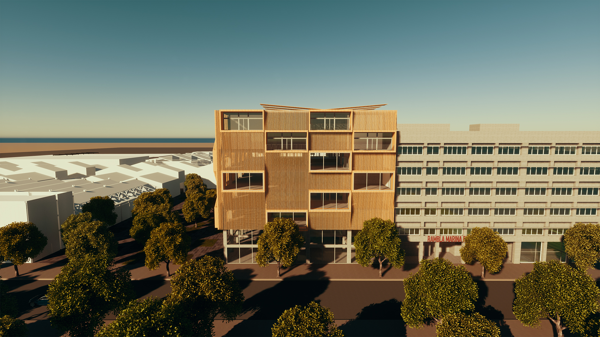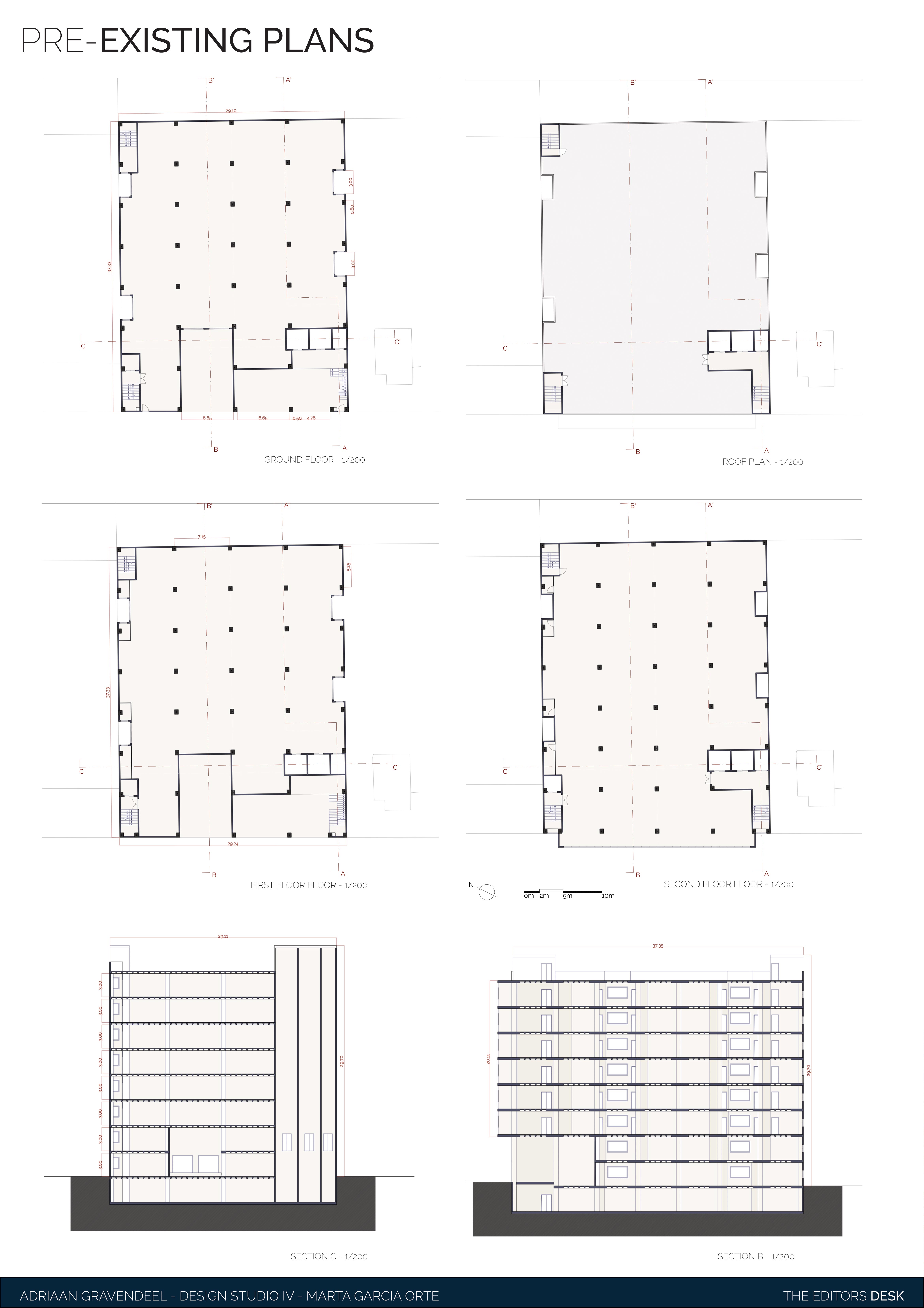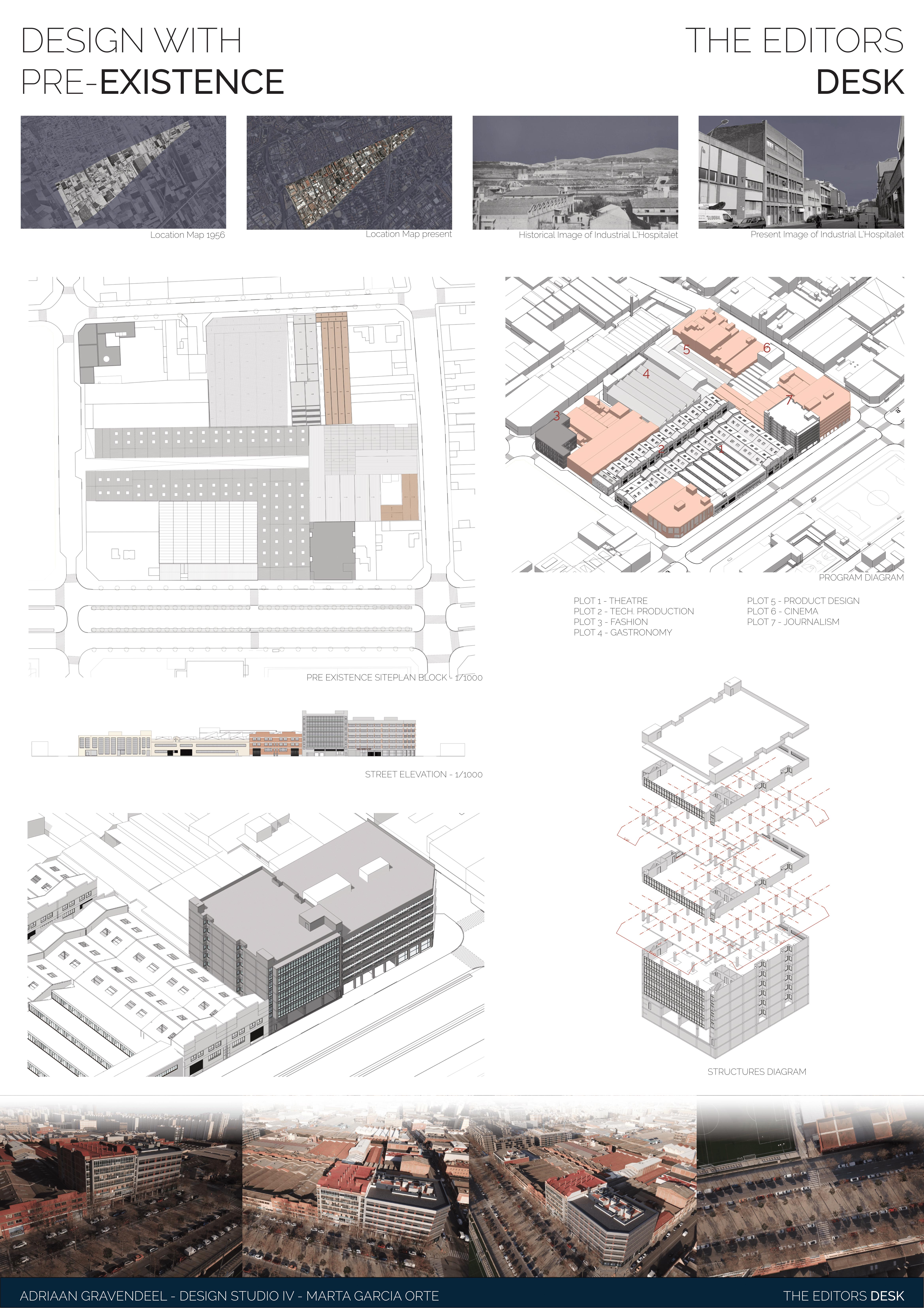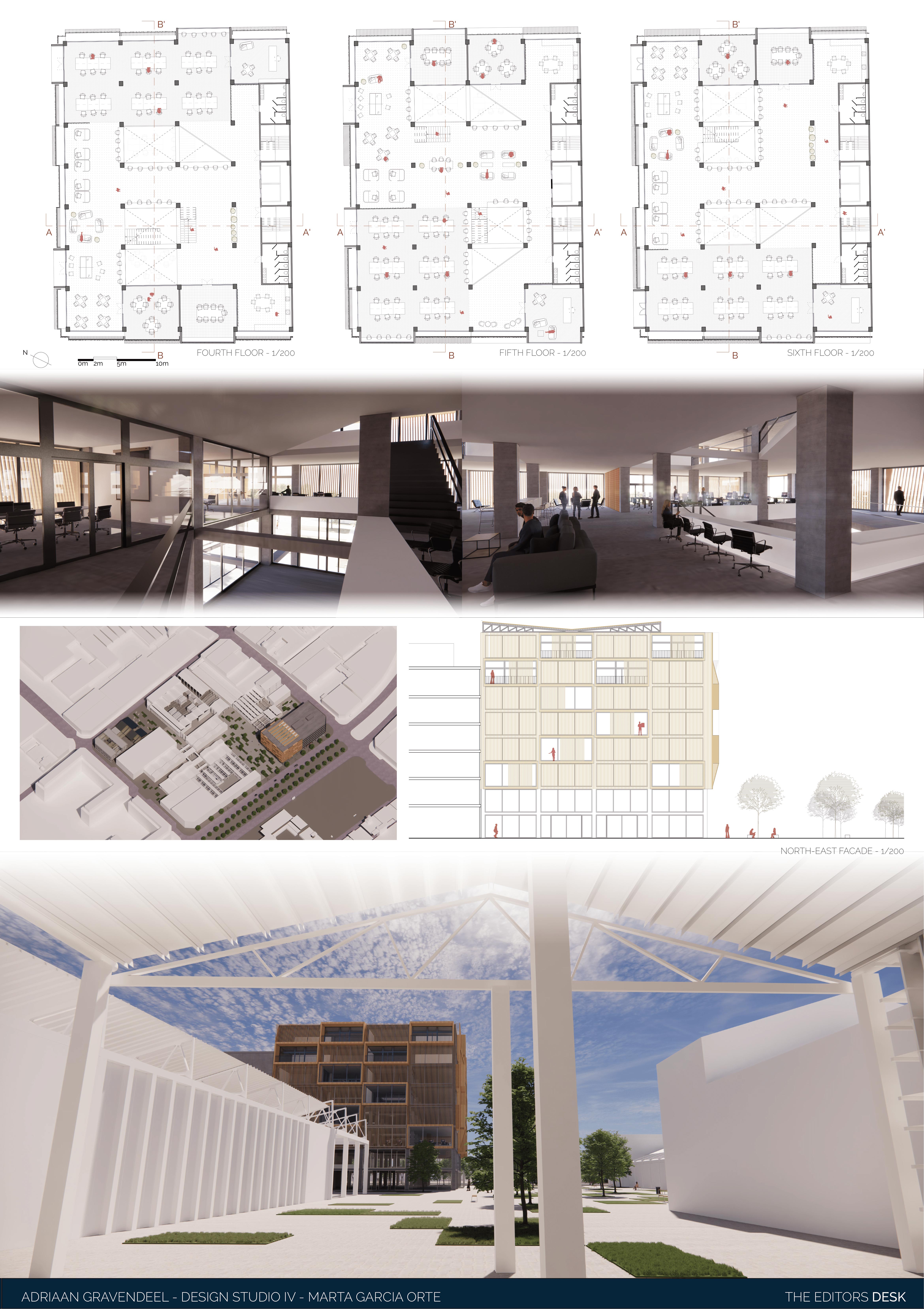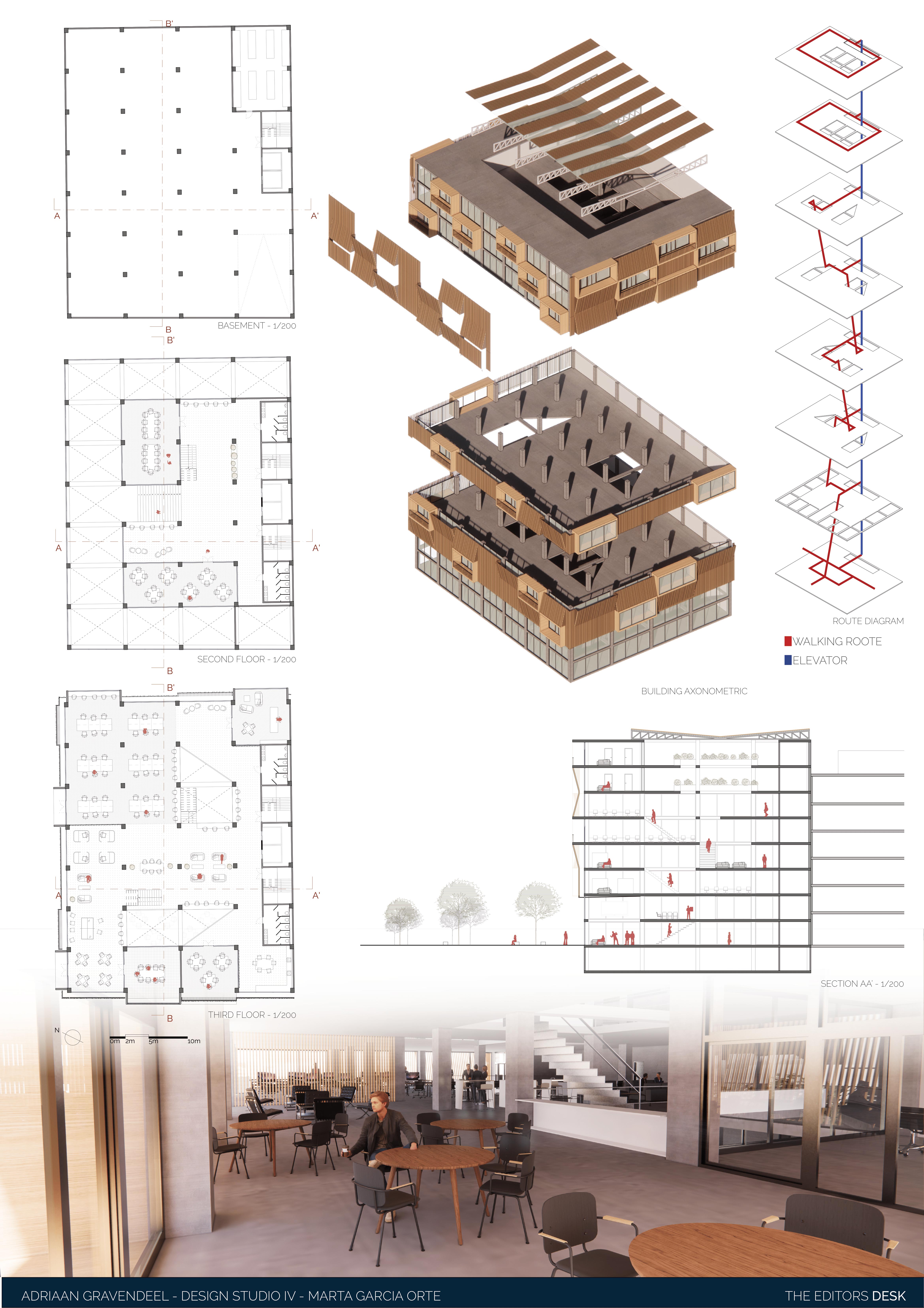 The assignment to redesign a building to a new purpose, the adaptive reuse, is always an interesting challenge. The existing structure, often contains structural elements that constrict the redesign. When successfully executed the old and new find a beautiful coexistence and give new life to the old. In this case the former office building is built around pillars connected by horizontal connecting beams, which cannot be removed. The design presented here combines residential with commercial purpose. The lower floors are to be used as head-office for a journalism firm, with a dynamic atmosphere. This is created by extending the workspace over the different floorlevels. Furthermore open spaces are created in between, which also cross the “natural” floor borders. The top the building contains the residential part of the building. It is a mix of sizes allowing for several social classes to coexist. The façade is a 3-dimensional design, to emphasize the dynamic of the redesign. It symbolizes the ever active and inquiring nature of the journalism inside.