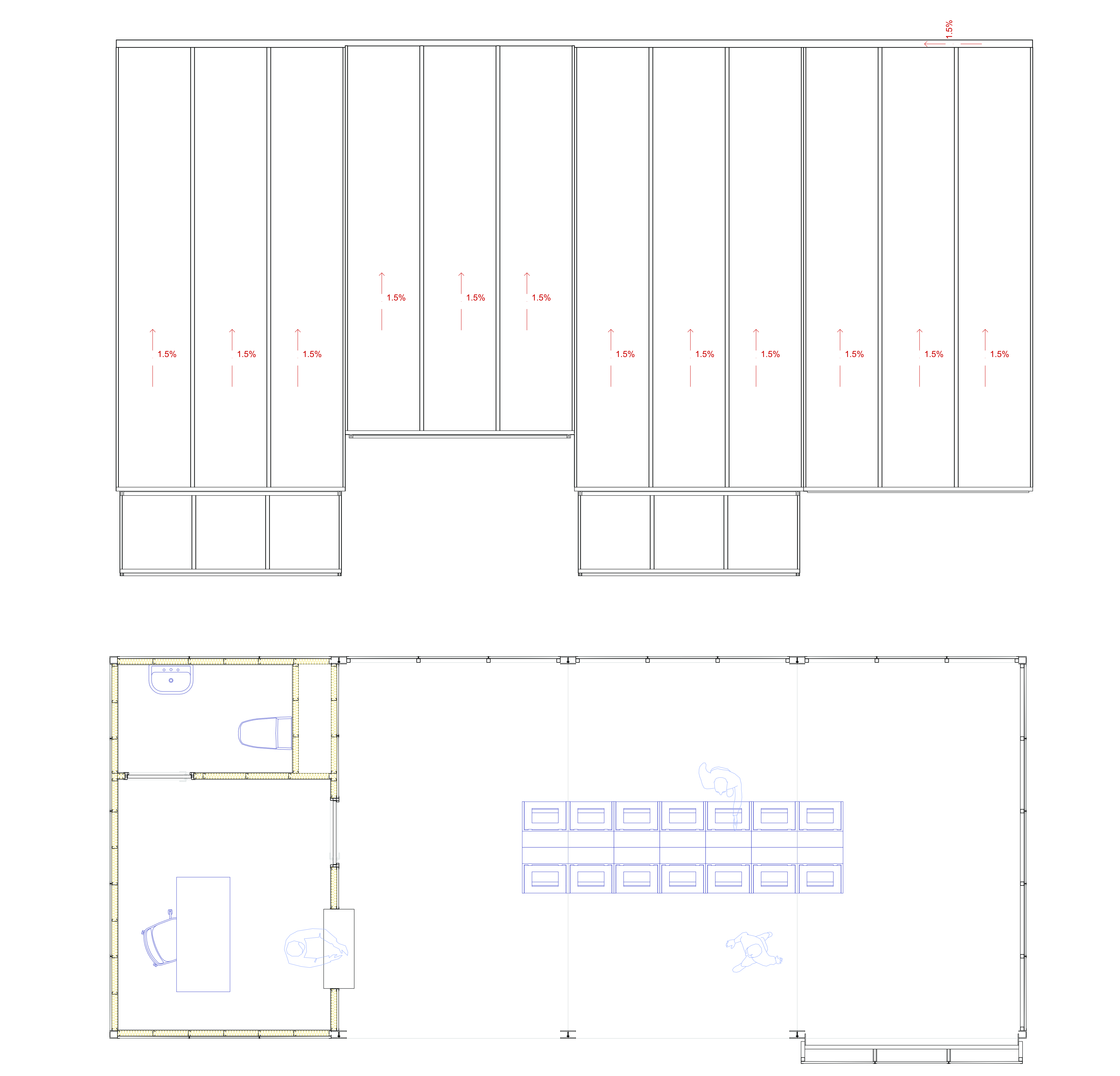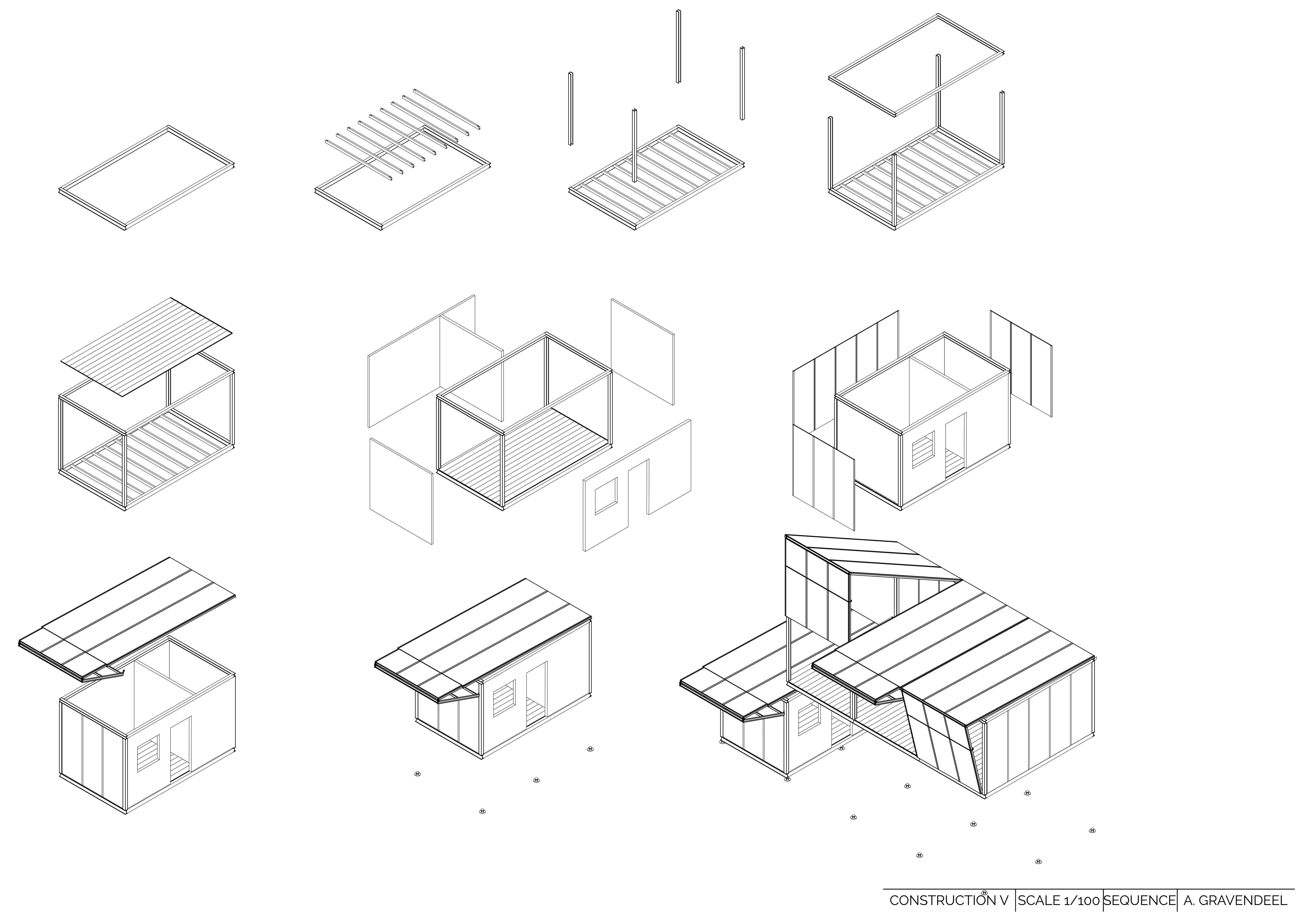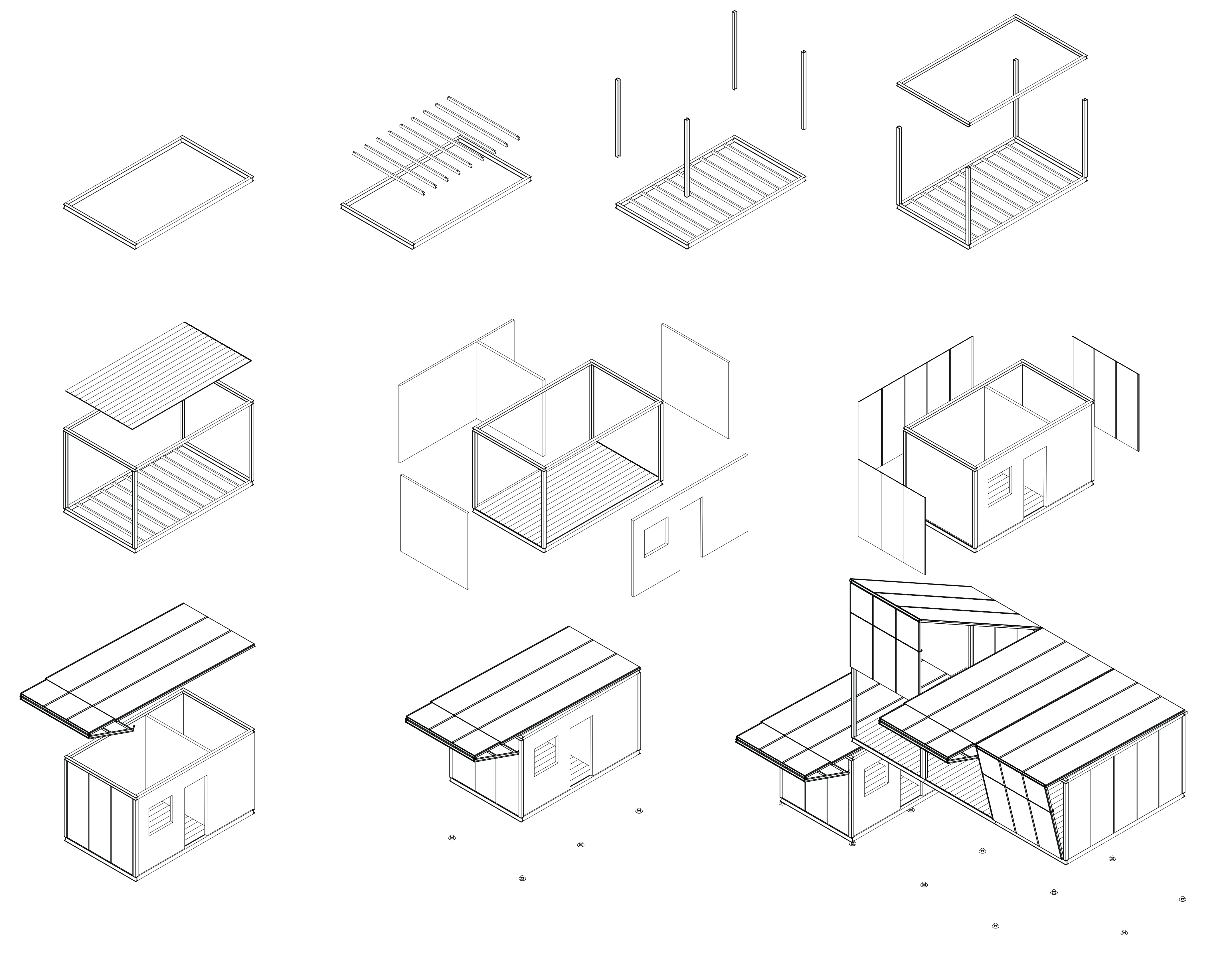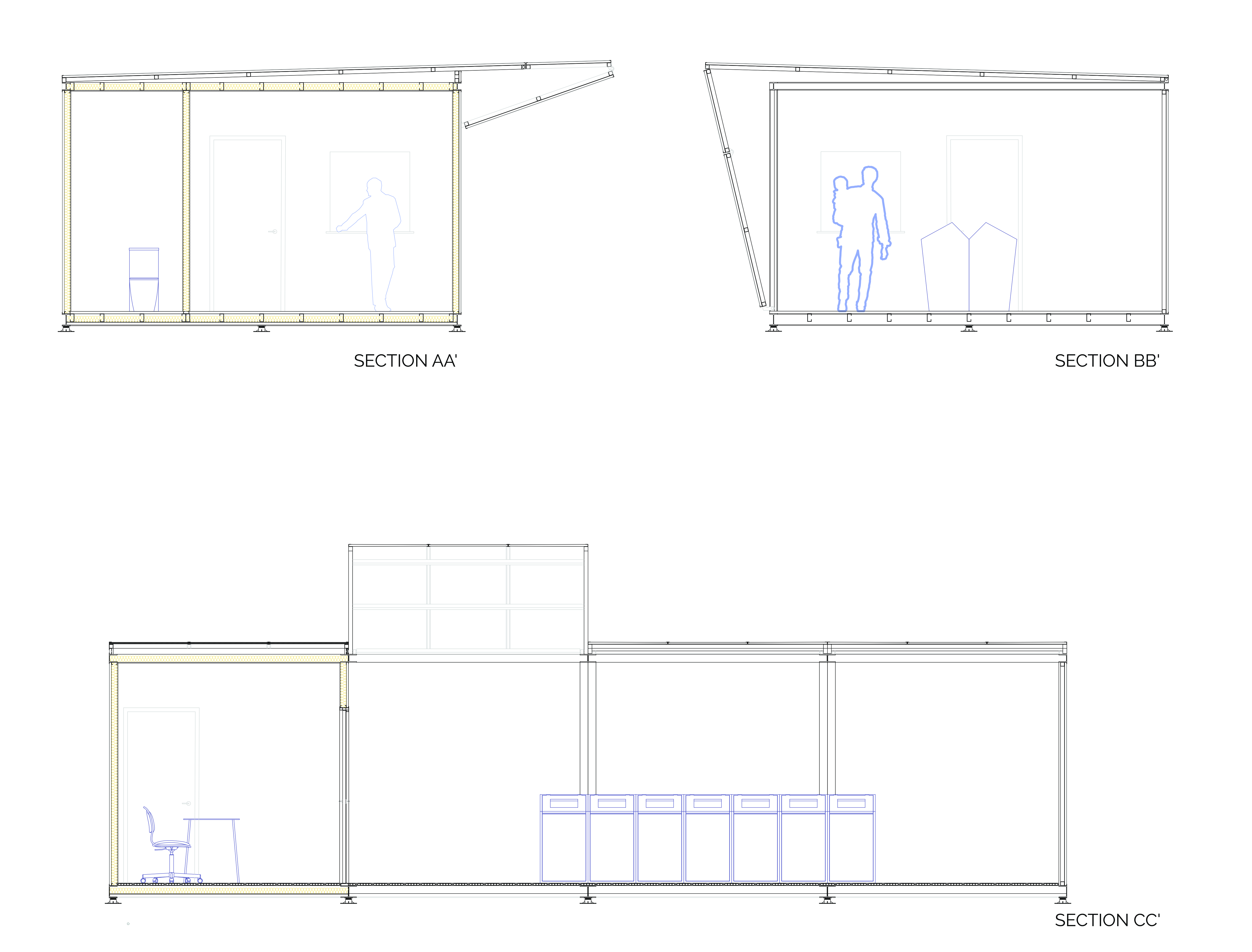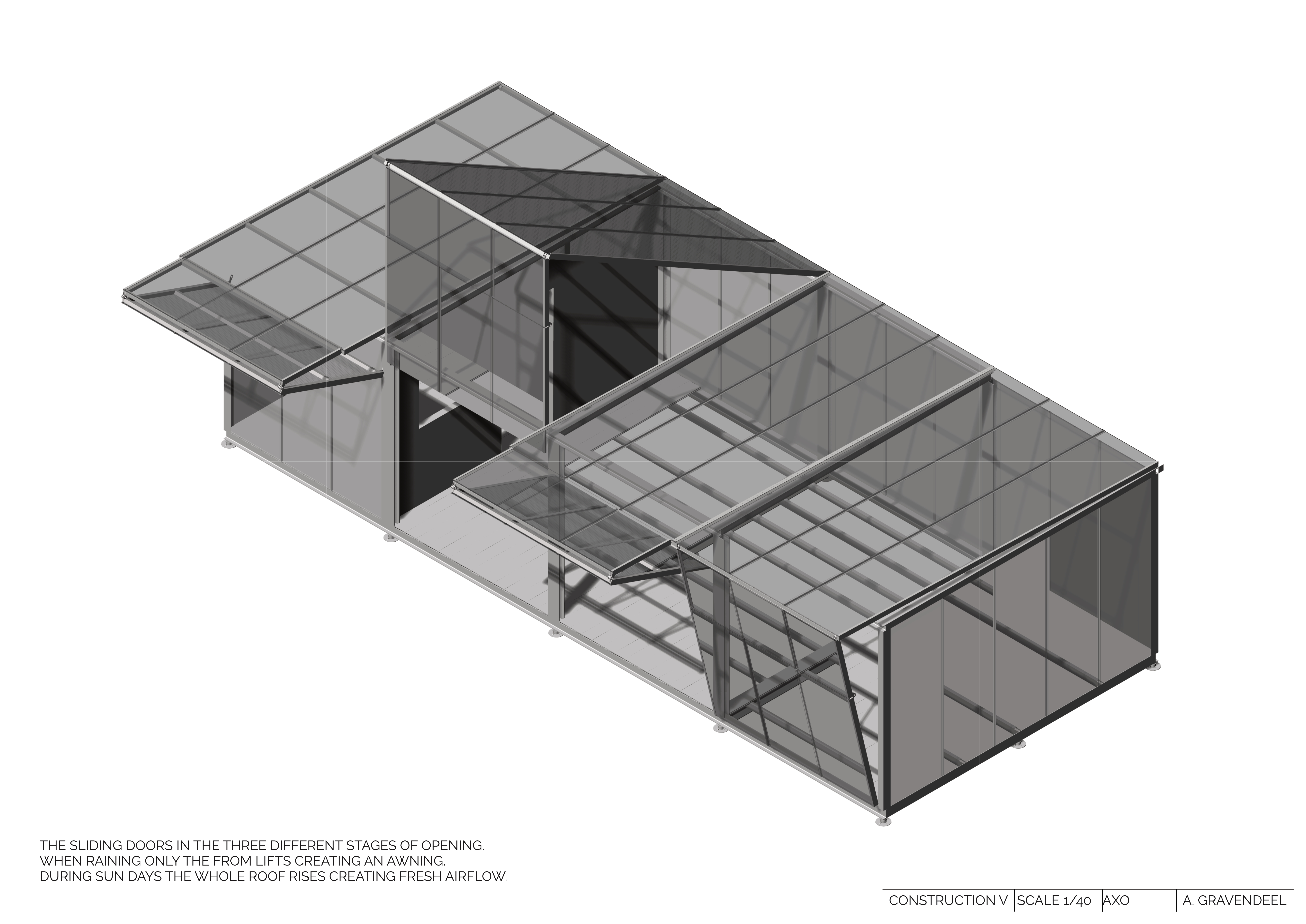 The modules have a roof/opening that lifts the front side of the building up (shown in the AXO sequence). It can either lift the roof + the front creating natural light and airflow through the building, or only the front folds up. Creating an awning to protect against the rain.
