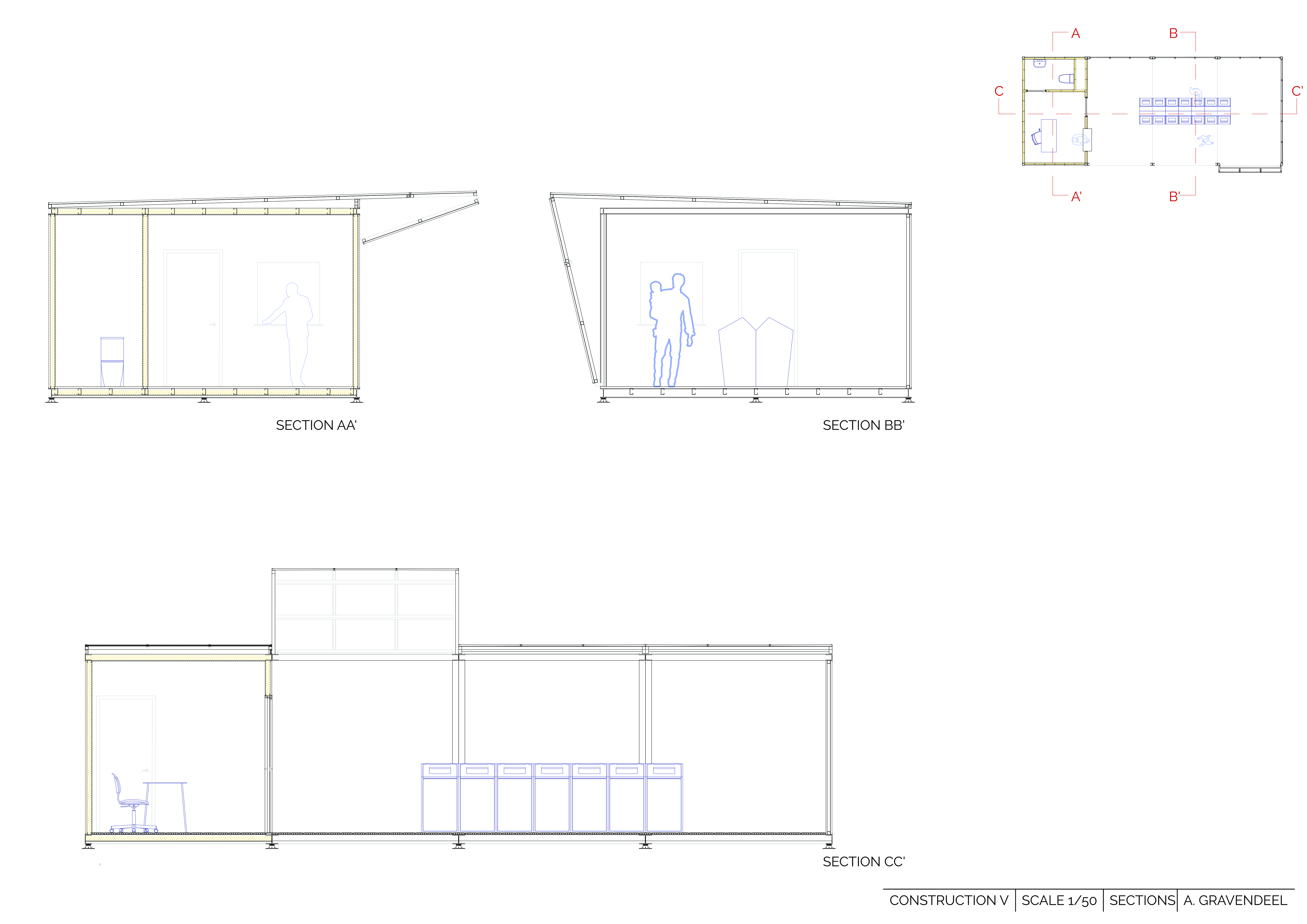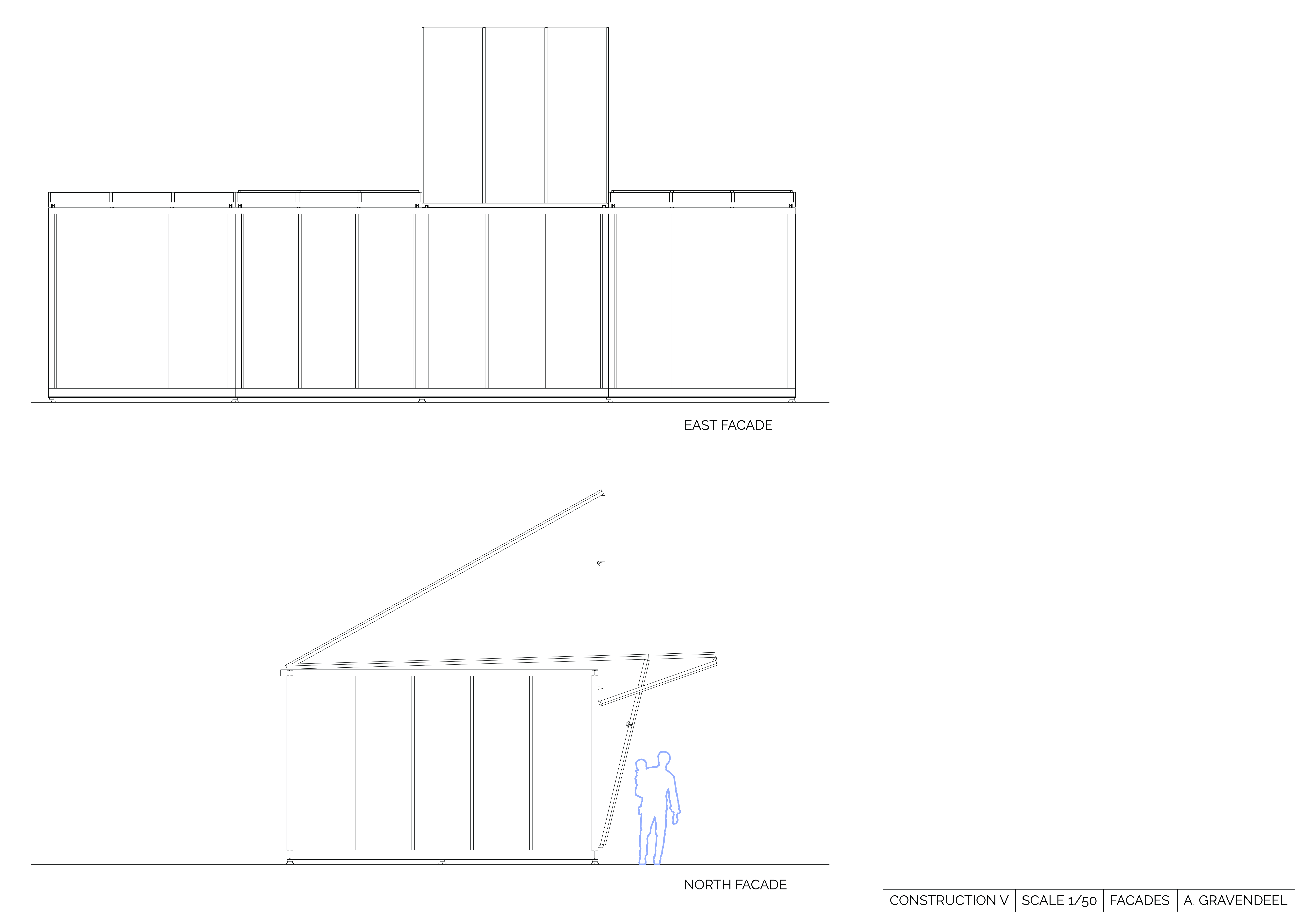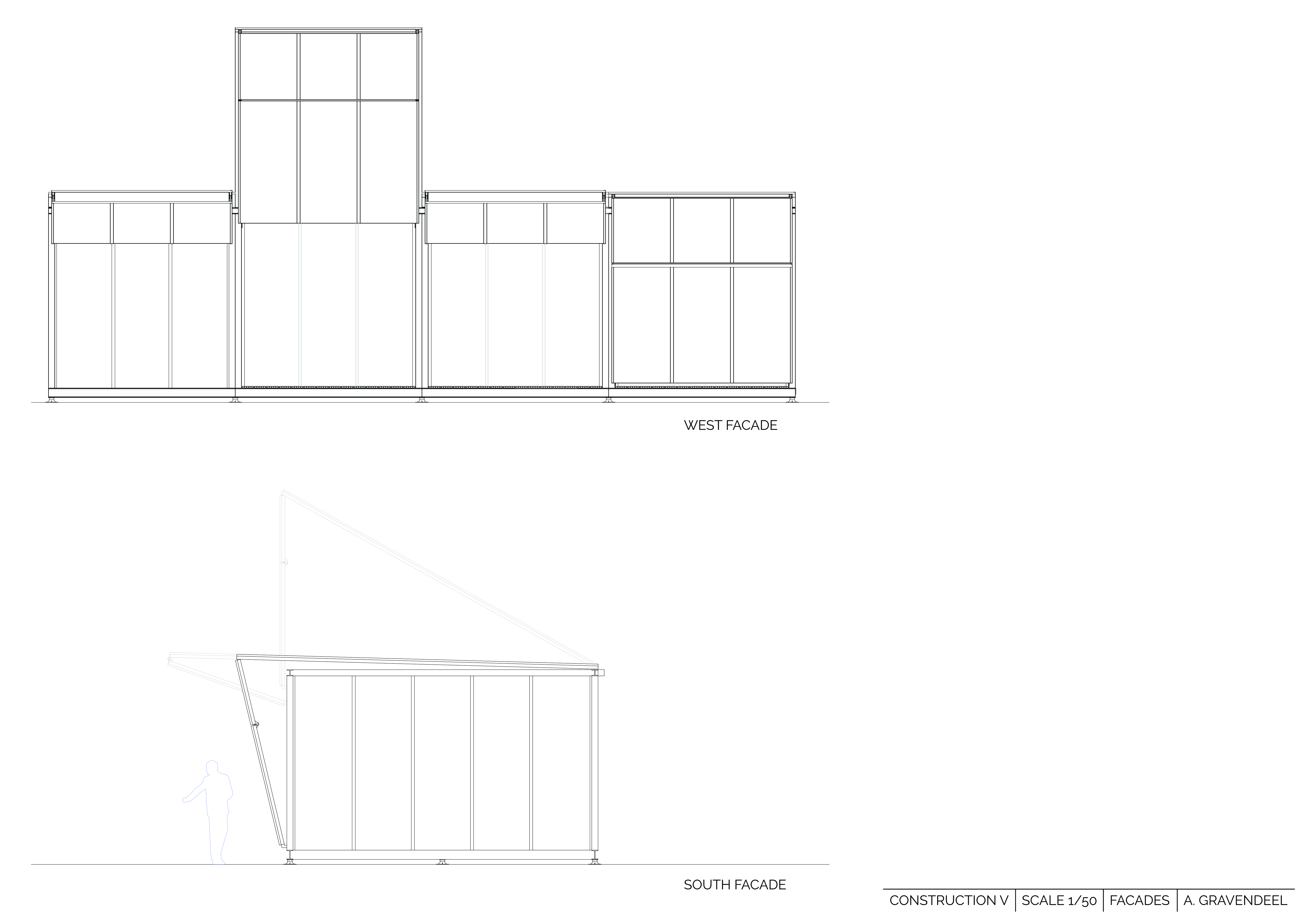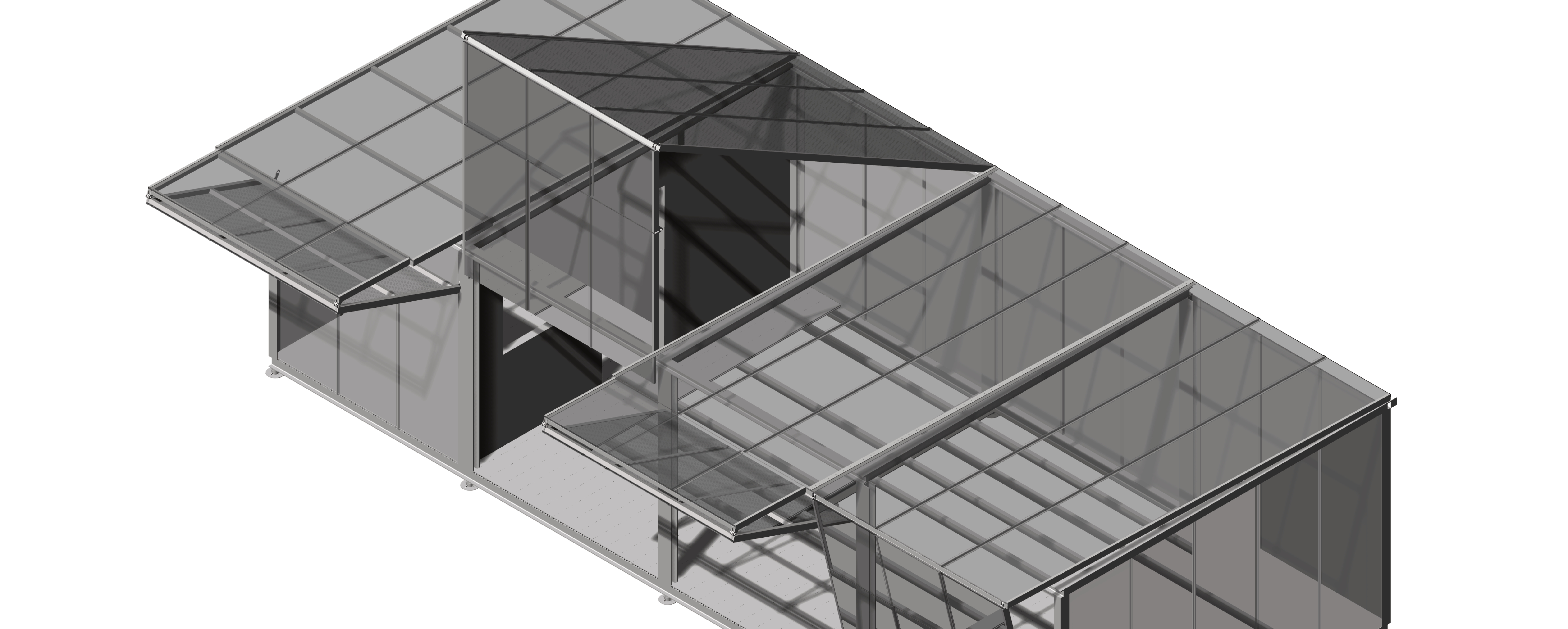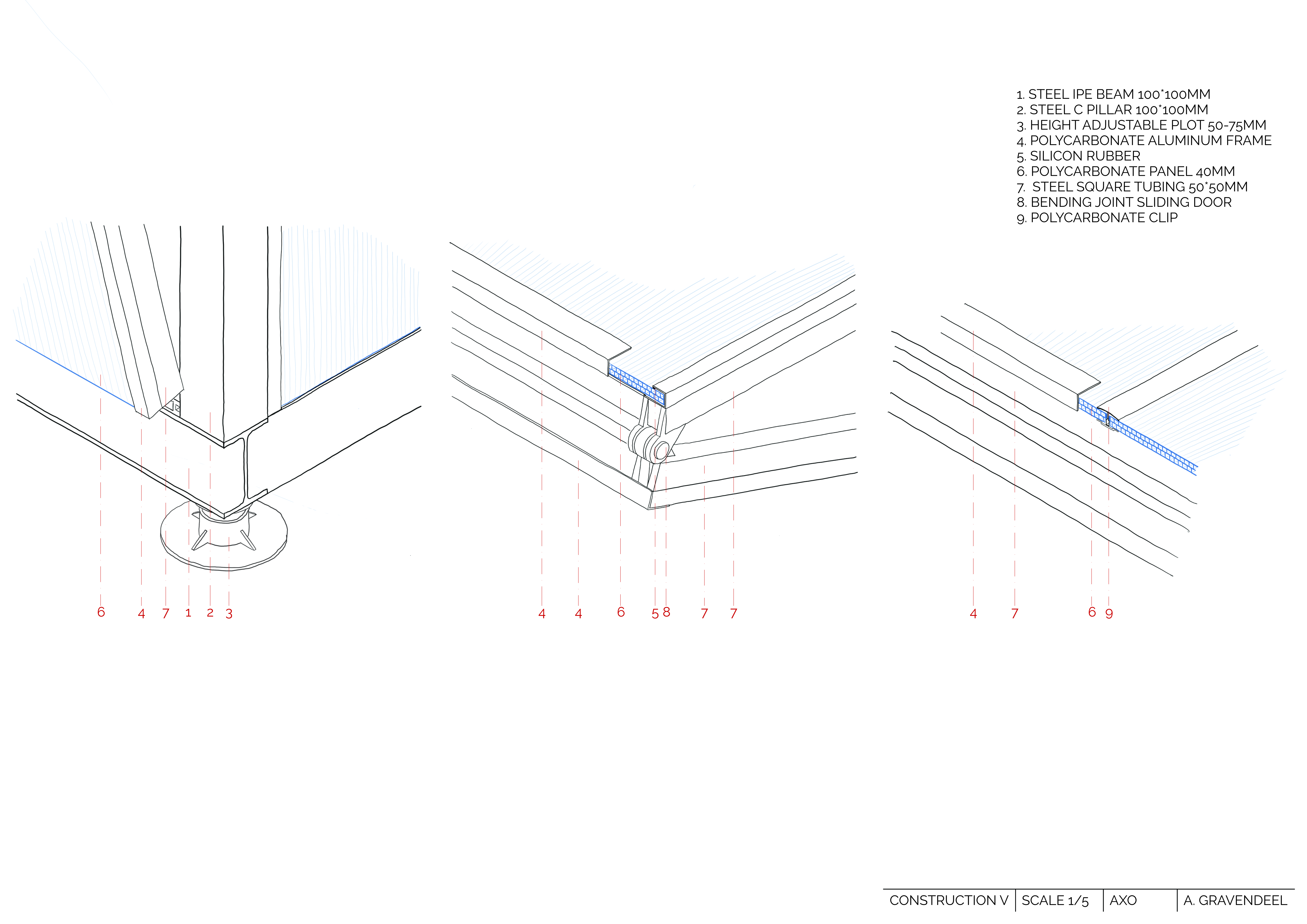 The modules have a roof/opening that lifts the front side of the building up (shown in the AXO sequence). It can either lift the roof + the front creating natural light and airflow through the building, or only the front folds up. Creating an awning to protect against the rain.