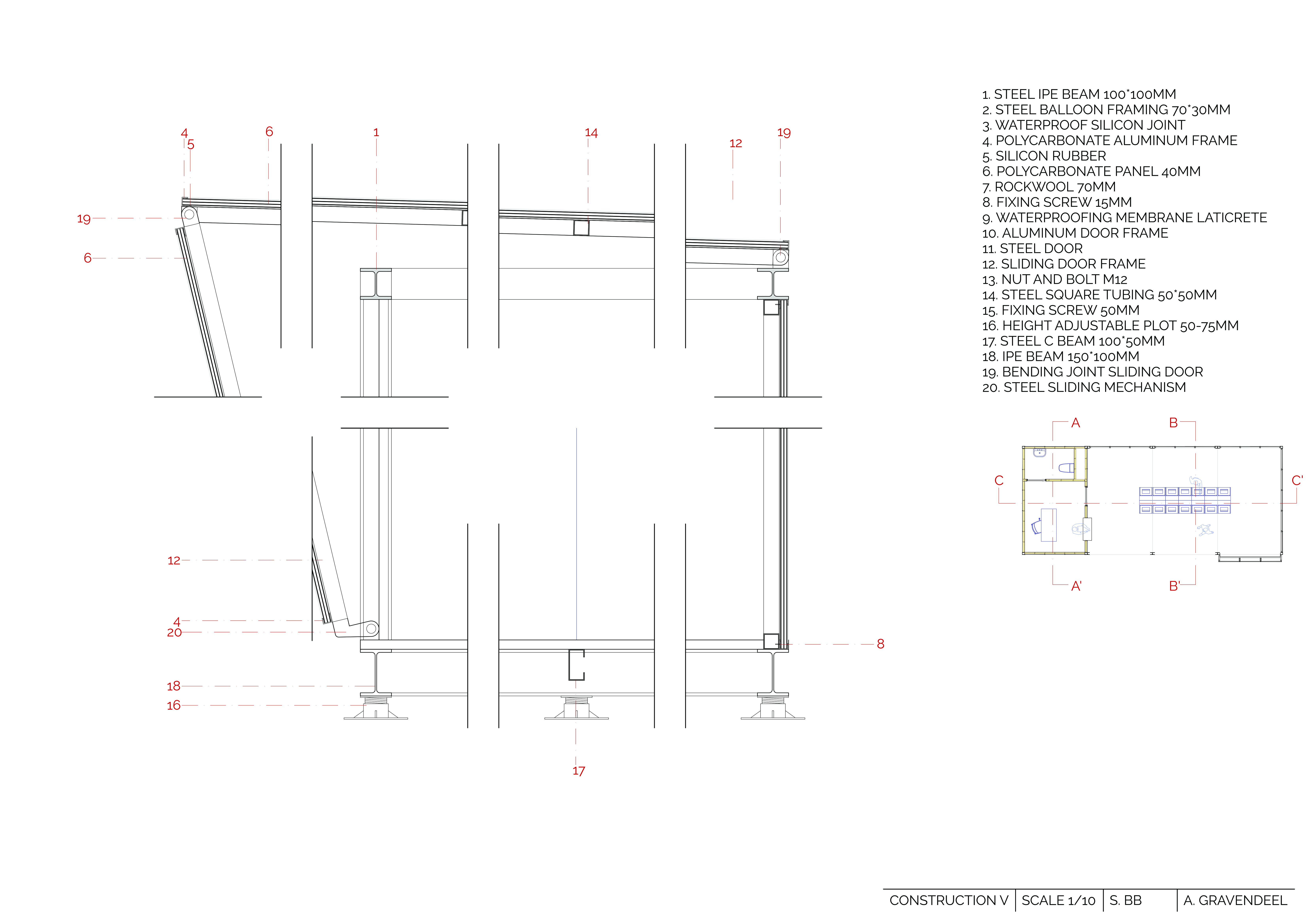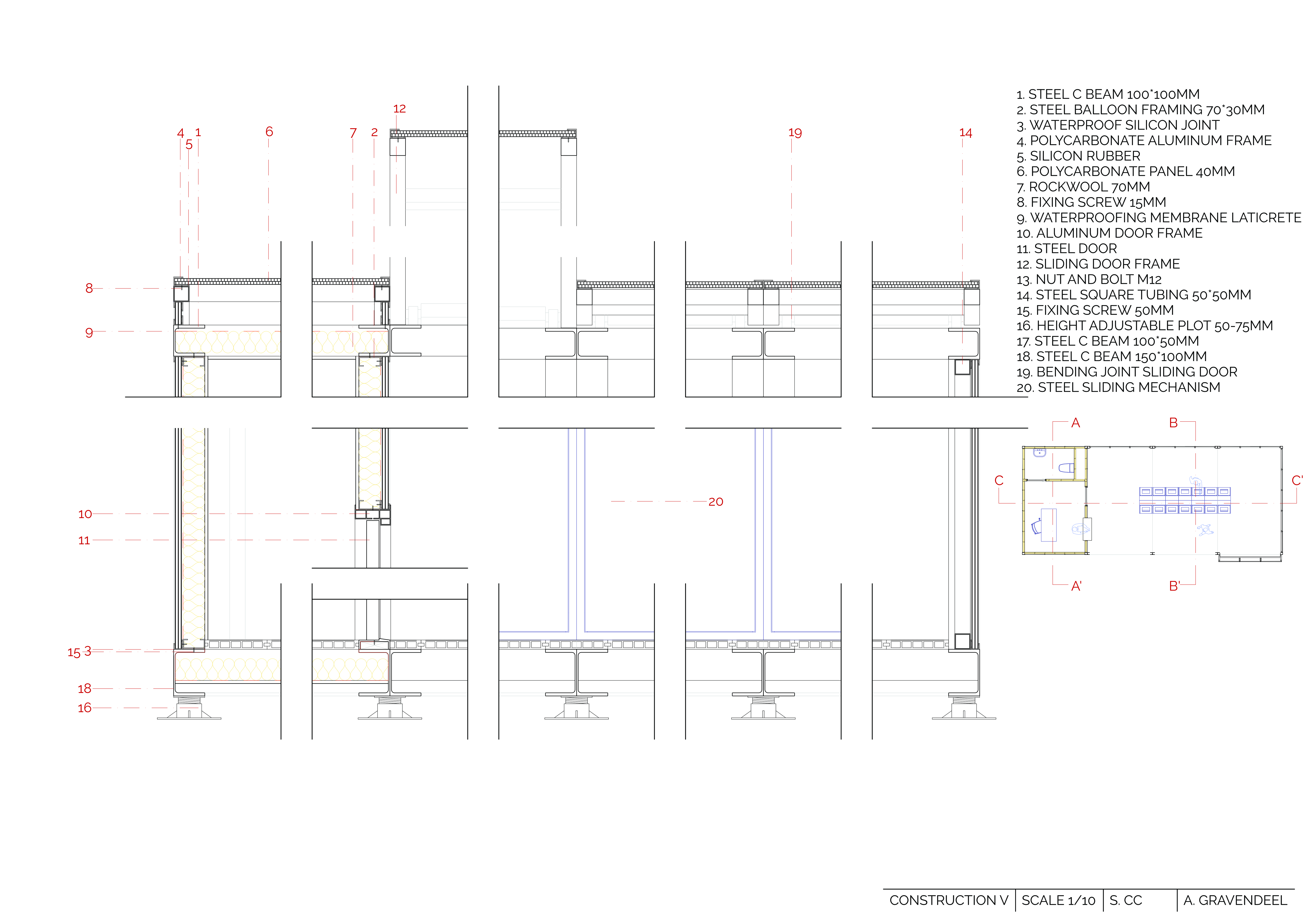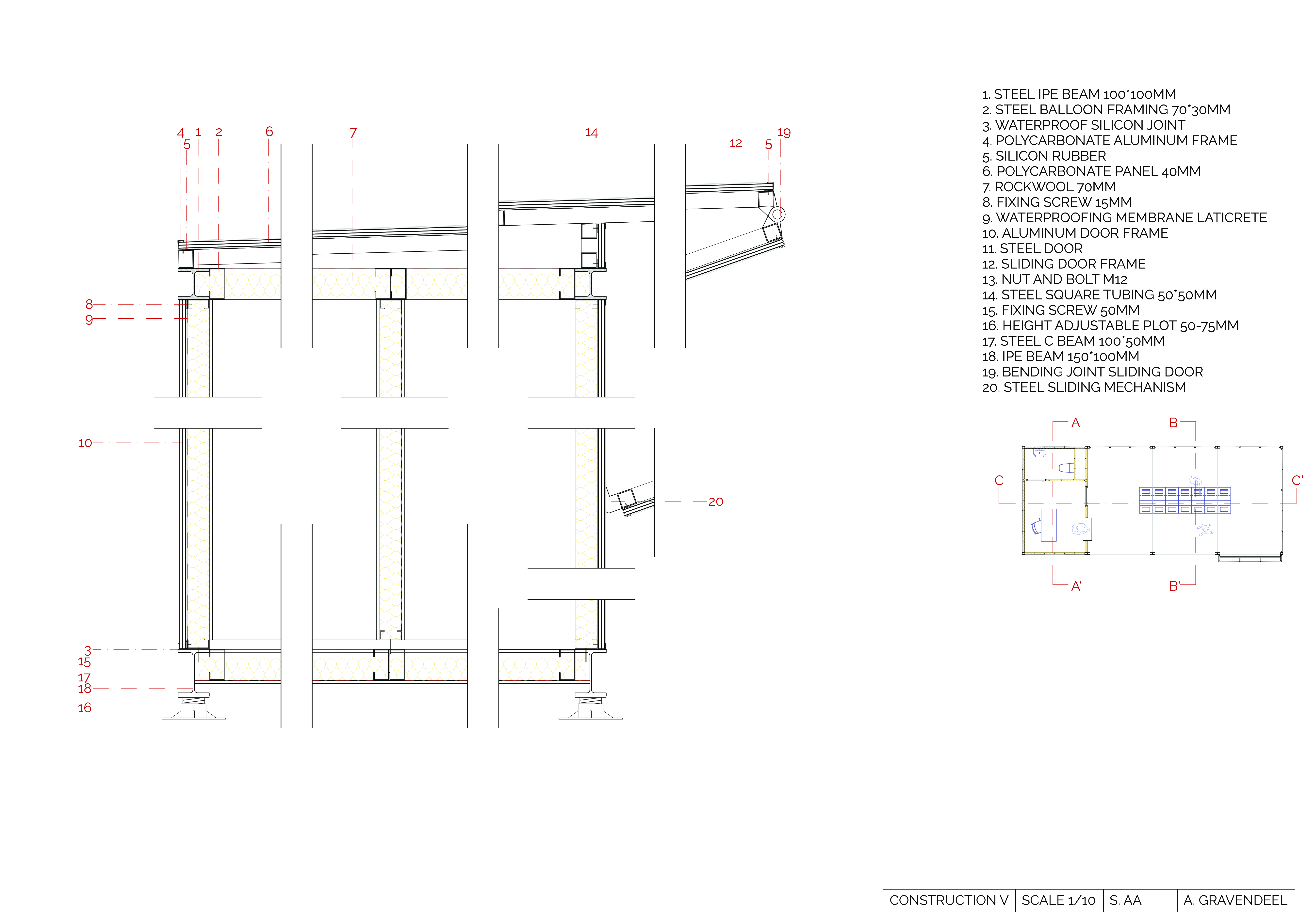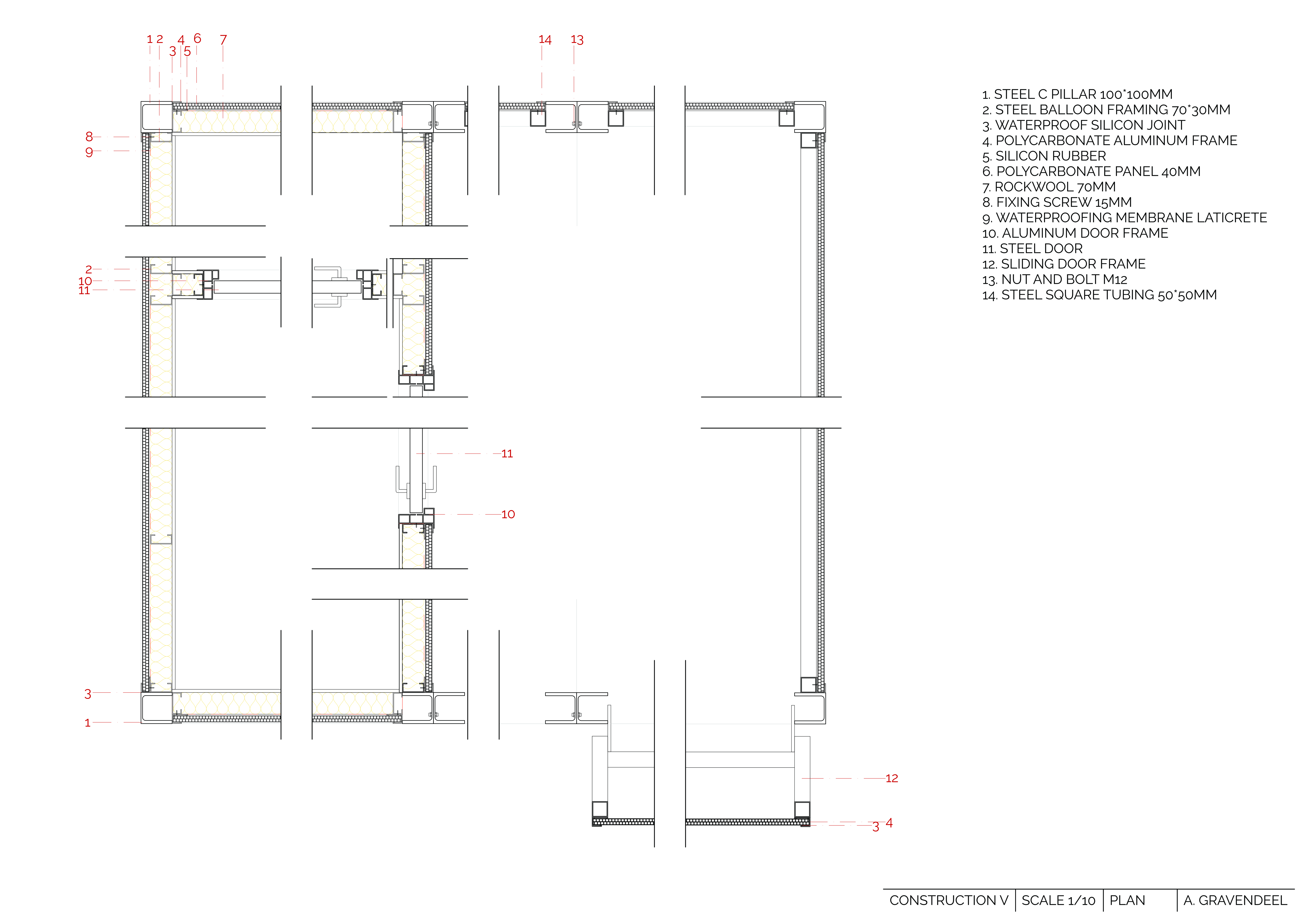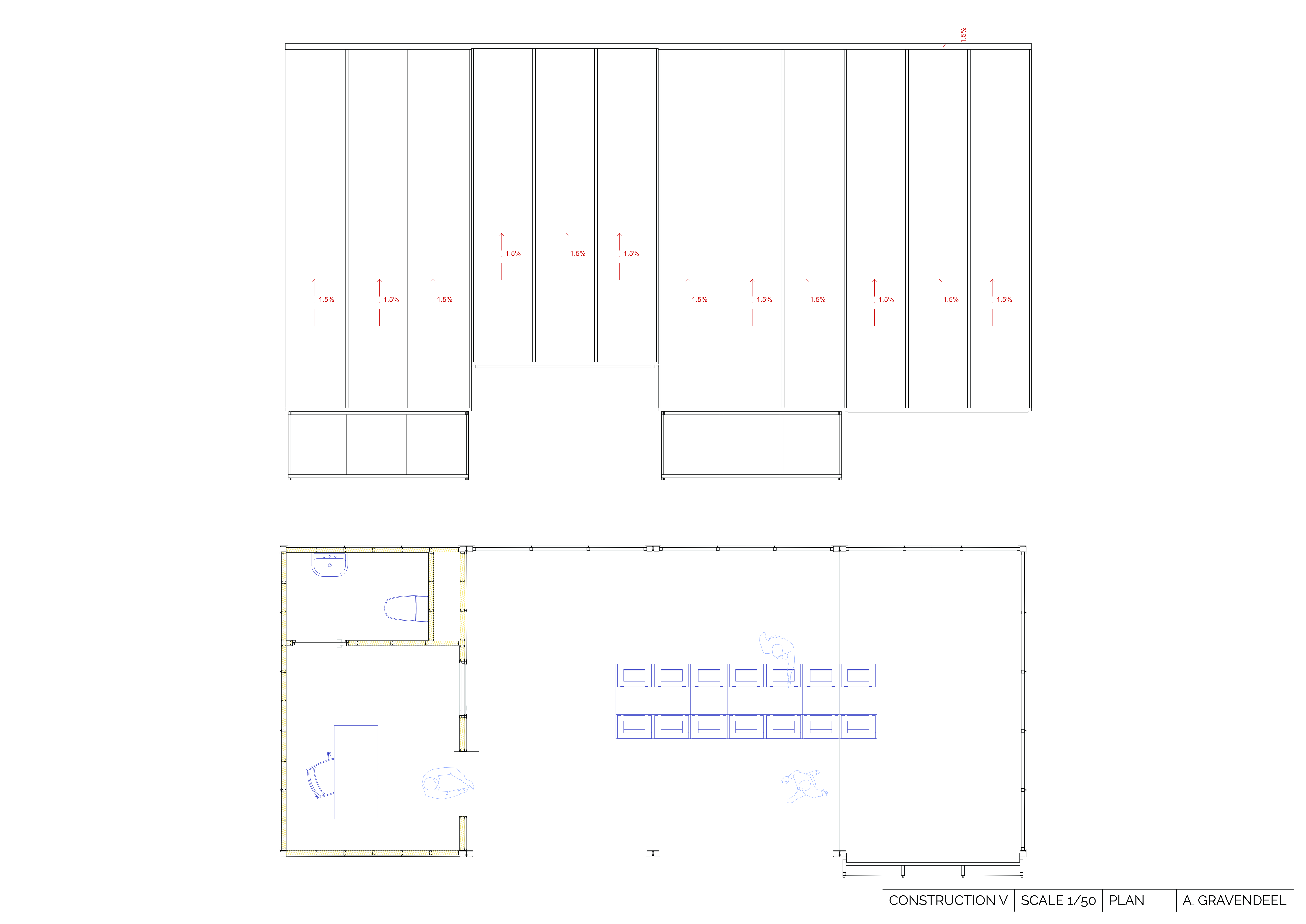 The modules have a roof/opening that lifts the front side of the building up (shown in the AXO sequence). It can either lift the roof + the front creating natural light and airflow through the building, or only the front folds up. Creating an awning to protect against the rain.